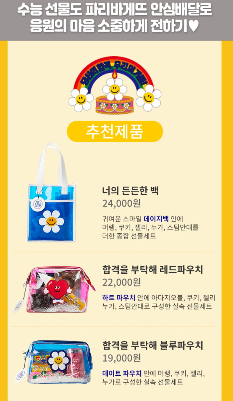 귀여운 스마일 데이지백 안에 머랭, 쿠키, 젤리, 누가, 스팀안대로 구성되어 있는 종합 선물세트