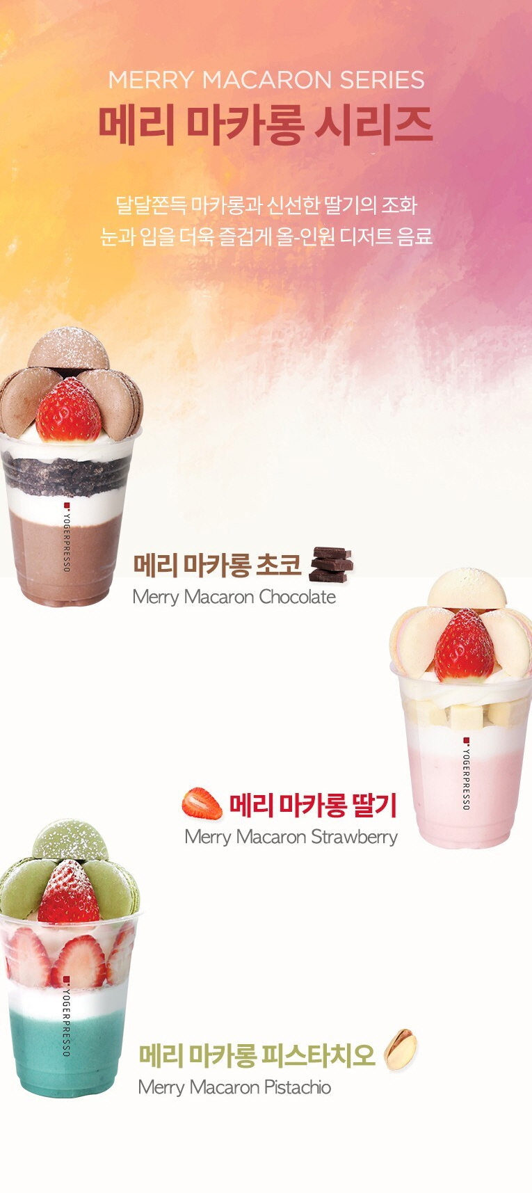 메리 마카롱 음료는 음료에 달달한 마카롱과 토핑들, 그리고 신선한 딸기까지 가득 올려 눈과 입을 더욱 즐겁게 만들어줄 올-인원 디저트 음료라고 합니다.