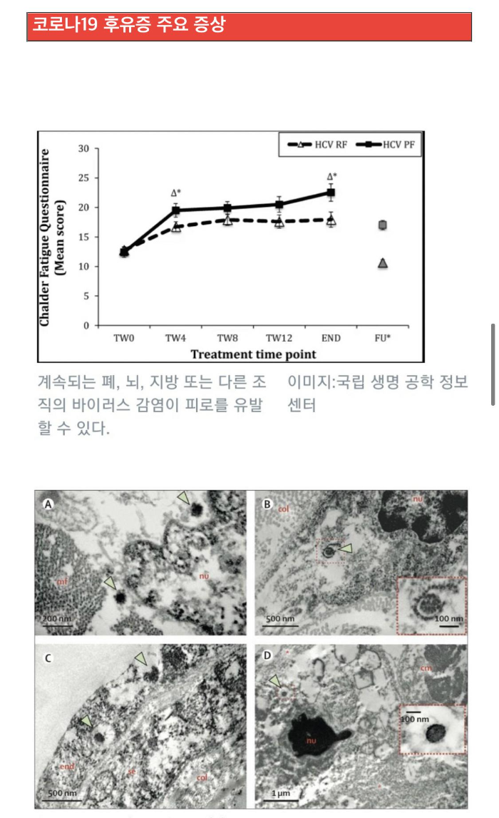 ■ 폐 손상과 호흡곤란 - 폐조직이 섬유화되거나, 코로나19 감염 시 폐가 뿌옇게 보이는 간유리음영이 회복후에도 사라지지 않는 증상. 숨이 가빠질 때가 있다고 합니다.