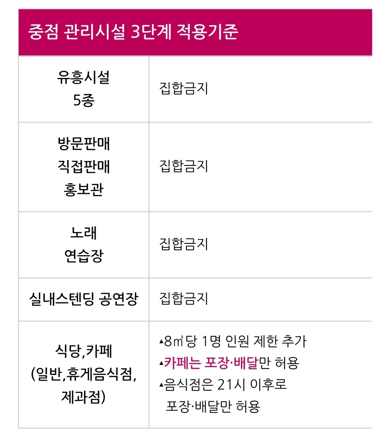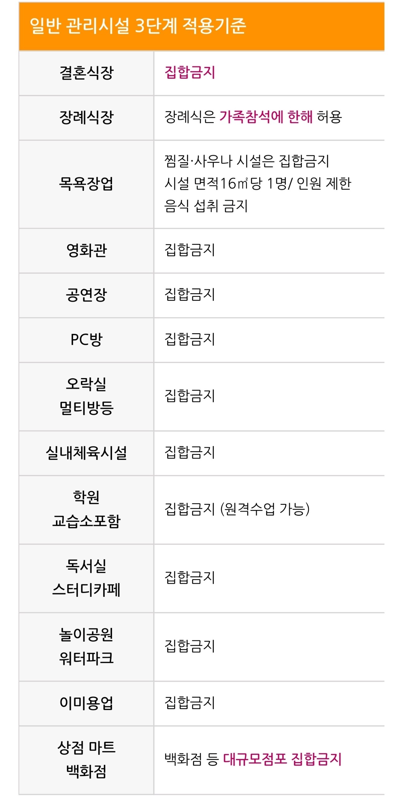 코로나 3단계 조치에 들어가면 일반적으로 우리가 이용하는 모든 시설들은 집합이 금지됩니다.
