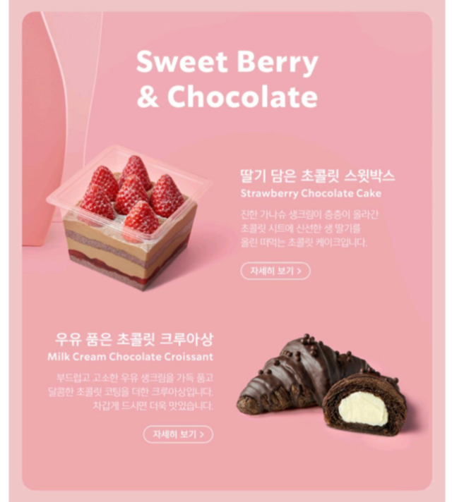 스타벅스 스트로베리 푸드는 '딸기 담은 초콜릿 스윗박스, 우유 품은 초콜릿 크루아상' 총 2종 입니다.