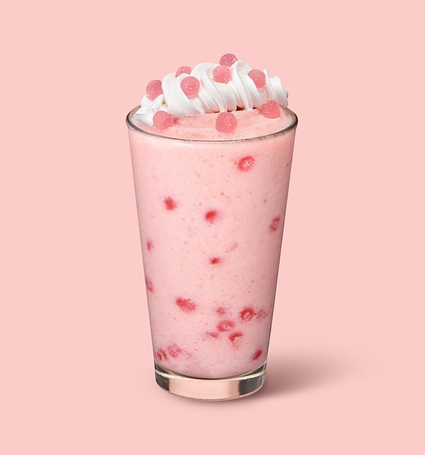 말랑하고 쫀뜩한 딸기 젤리가 들어있는 새로운 딸기의 식감을 즐길수 있는 음료.