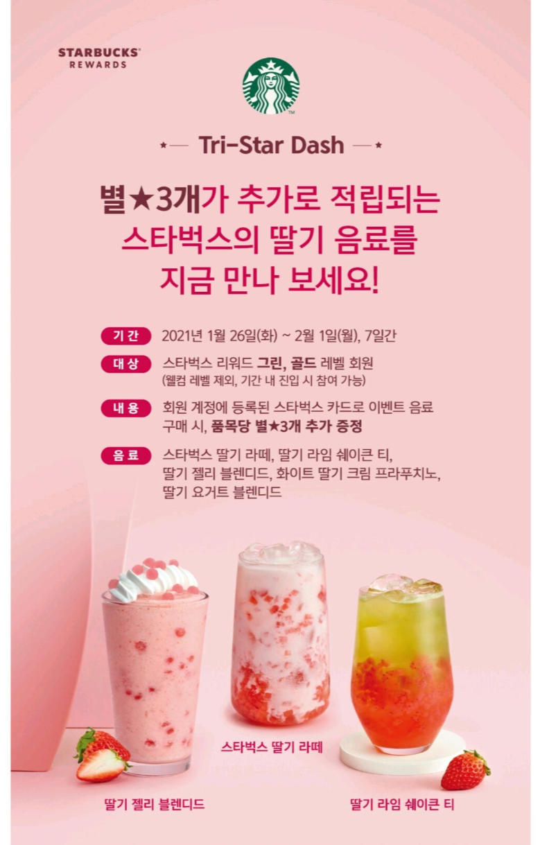 별 ★3개가 추가로 적립되는 스타벅스의 딸기 음료 놓치지 마시고 꼭 적립받으세요~!