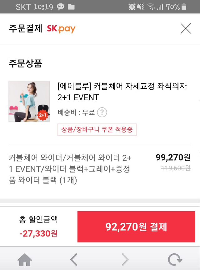 저는 에이블루 커블체어 와이더 3개 상품을 99,270원에 구매했습니다.