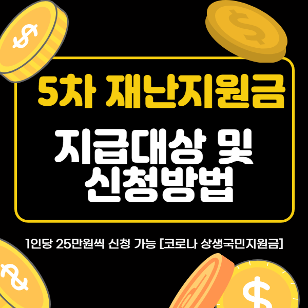 5차 재난지원금은 코로나상생국민지원금으로 전 국민의 약 88%가 받을 예정이며, 1인당 25만원씩 지급될 예정입니다.