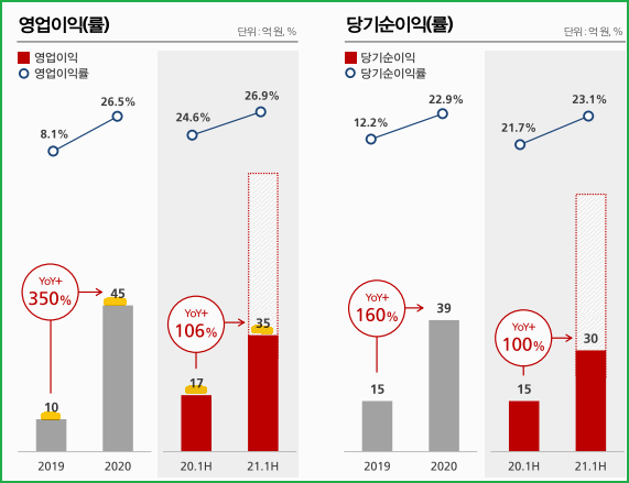 2020년 상반기에 69억원이었던 매출액은 2021년 상반기에 130억원으로 상승했으며, 전년 동기간 대비 88% 성장률을 보였습니다.