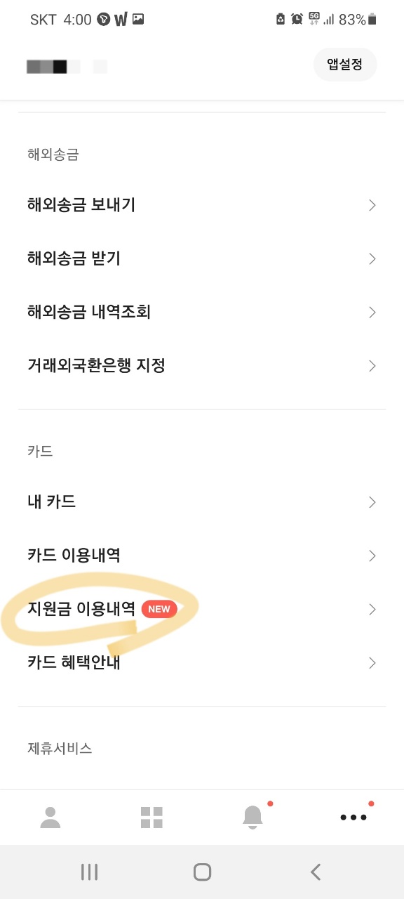 밑으로 내려가다보면 카드항목에 지원금 이용내역이 있습니다.