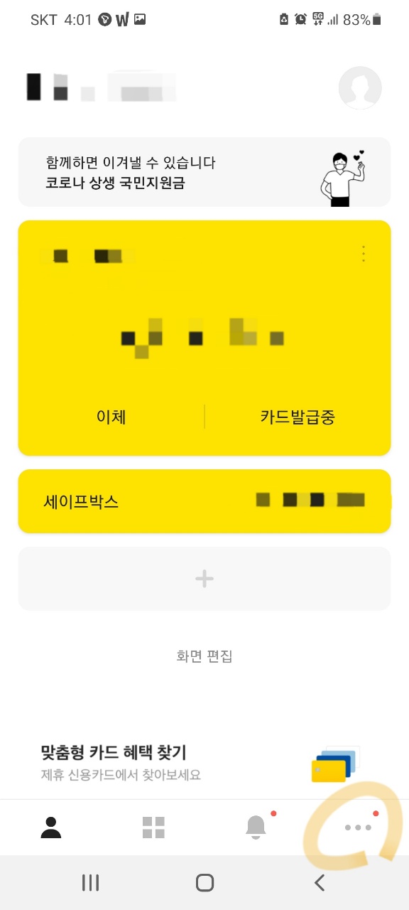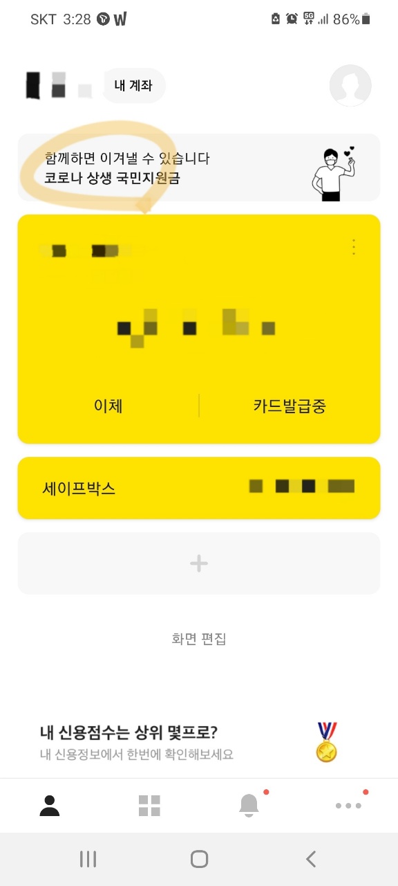 먼저 카카오뱅크를 통해 국민지원급을 신청하시려면 카카오뱅크 어플에 들어가셔야 합니다.
