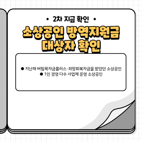이번 방역지원금은 최대한 빠르게 지급할 예정이라고 하는데요. 2차 지급대상자에 포함된다면 오전 9시부터 안내 문자가 발송됩니다. 2차 신속지급 대상은 지난해 일반 소상공인 중 버팀목플러스 혹은 희망회복자금을 받은 소상공인이 해당됩니다.