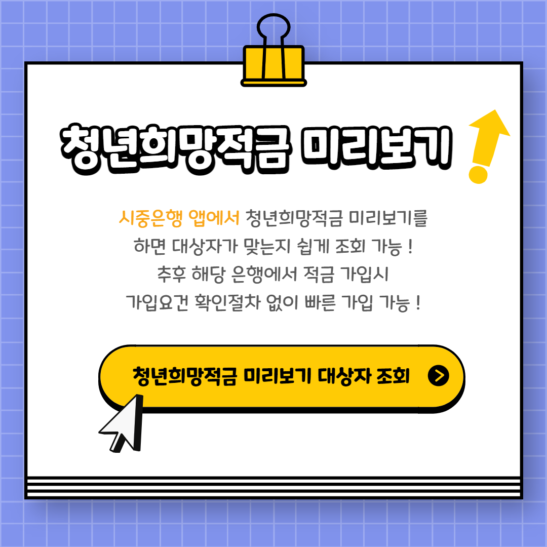 청년희망적금의 공식 출시를 앞두고 내일부터 가입 가능여부를 사전에 확인할 수 있는 청년희망적금 미리보기 서비스도 운영될 예정입니다.