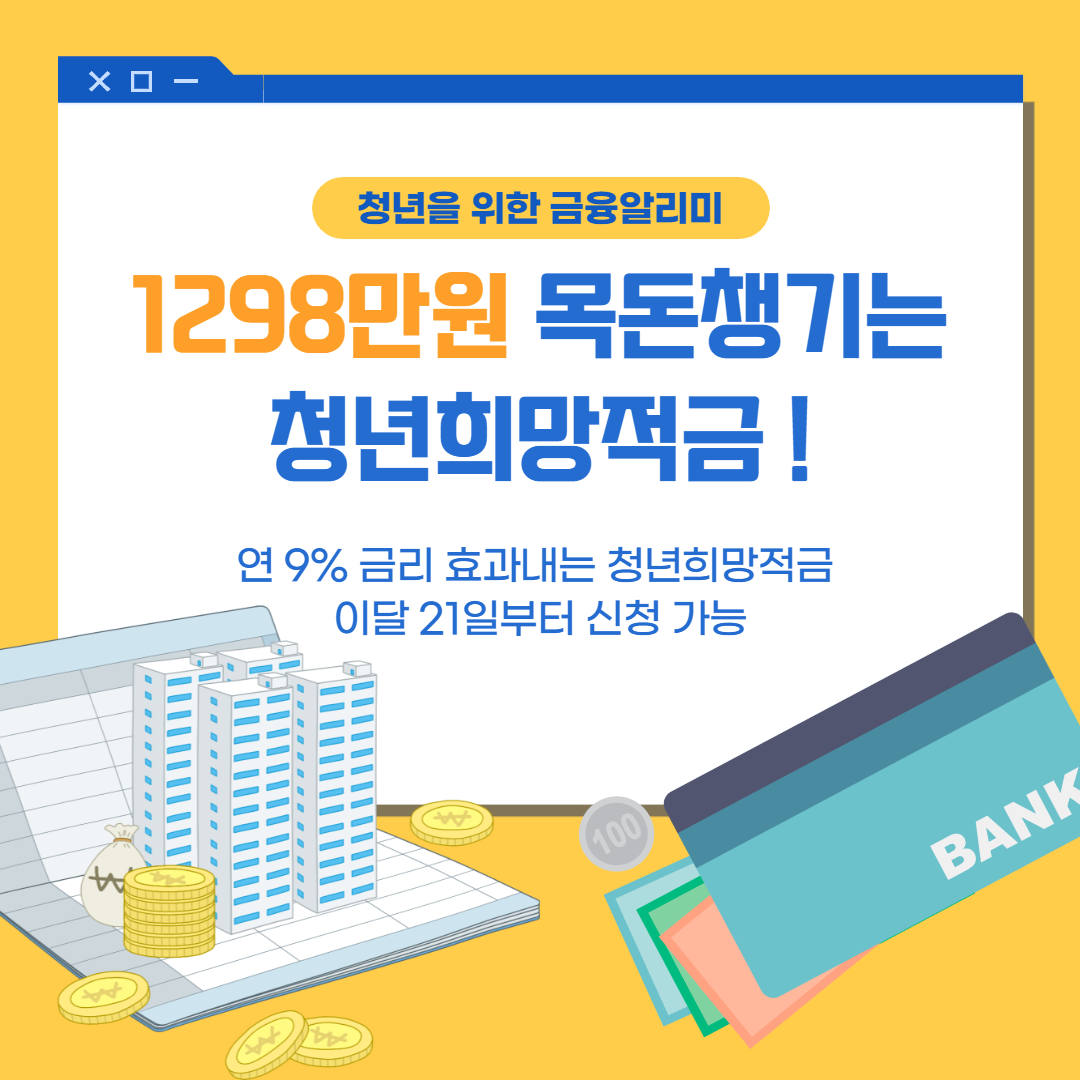 안녕하세요. 오는 21일 은행 기본이자에 최대 4%의 저축장려금을 지원받을 수 있는 청년희망적금이 출시됩니다.