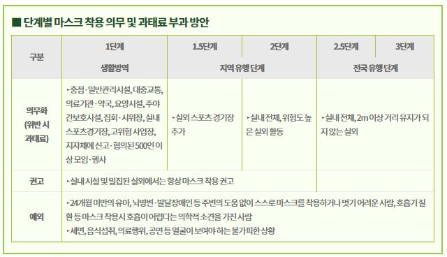 원칙적으로 실내 시설 및 밀집된 실외에서는 항상 마스크를 착용할것을 권고하되, 거리 두기 단계에 따라 마스크 의무화 및 과태료 부과 범위를 차등적으로 확대할 예정이라고 해요.