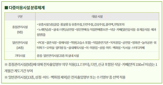 다중이용시설들에 대해서 집합금지 조치는 최소화 하되, 기존 고, 중, 저 위험시설 3층 구조는 중점관리시설(9종)과 일반관리시설(14종) 2층 구조로 단순화해서 재정비 했다고 해요.