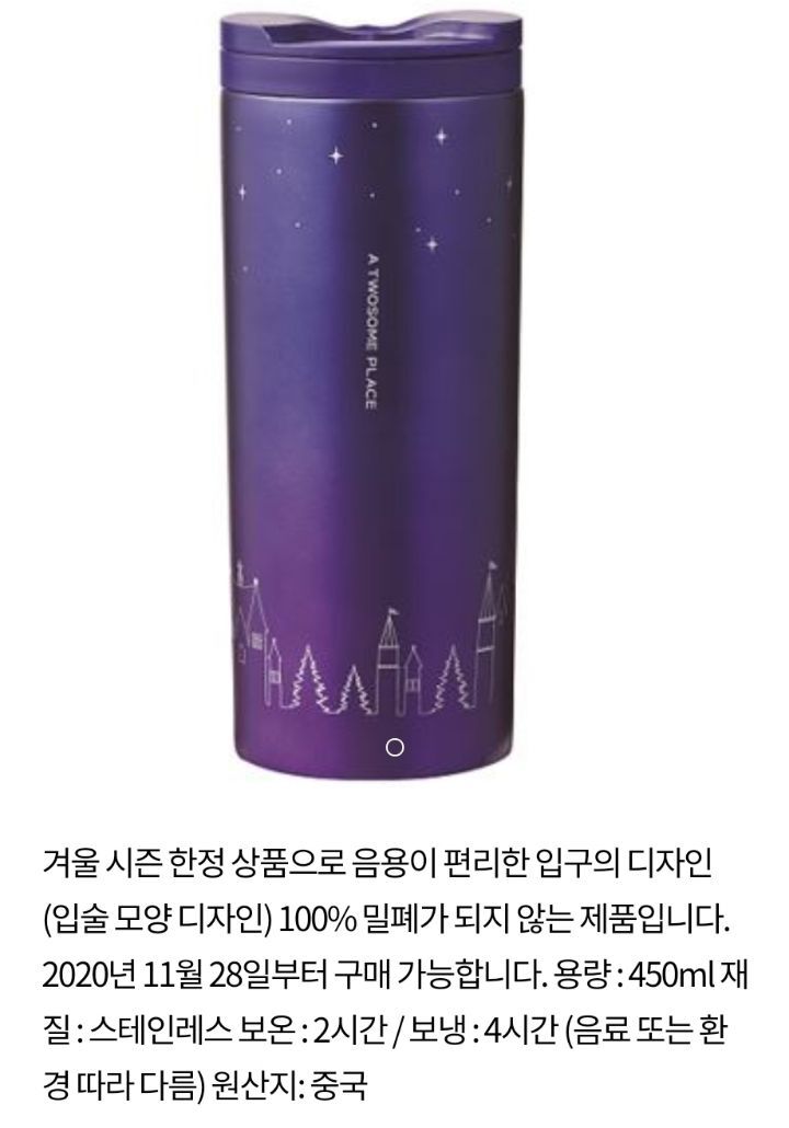 안녕하세요. 제가 좋아하는 카페 투썸에서 겨울 시즌 MD 가 나왔다고 하여 정보 가지고 왔어요~! 이번 상품은 올해 크리스마스 시즌 테마인 '원터판타지'를 모티브로 해서 '퍼플'과 '연보라'컬러